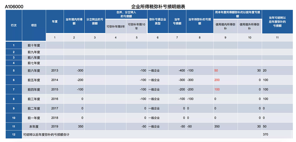 填報分析:A企業(yè)非高新技術(shù)企業(yè)和科技型中小企業(yè),虧損彌補(bǔ)年限為5年,即2019年申報時,可以彌補(bǔ)2014、2015這兩個年度產(chǎn)生的虧損;B企業(yè)2018年具備高新技術(shù)企業(yè)資格,因此,2013-2016年產(chǎn)生的虧損可以在10年內(nèi)進(jìn)行彌補(bǔ);A企業(yè)吸收合并B企業(yè)后,B企業(yè)的虧損彌補(bǔ)由合并后的A企業(yè)繼續(xù)按規(guī)定彌補(bǔ)。根據(jù)申報表填報說明中,“先到期虧損先彌補(bǔ),同時到期虧損先發(fā)生的先彌補(bǔ)”的原則,2019年度申報時,應(yīng)先彌補(bǔ)A企業(yè)2014、2015年度 200萬元和100萬元的虧損(A企業(yè)2013年的虧損2019年已超過法定彌補(bǔ)年限),然后剩余的50萬和境外所得30萬彌補(bǔ)B企業(yè)合并帶來的2013年度的虧損,不足部分20萬元結(jié)轉(zhuǎn)以后年度繼續(xù)彌補(bǔ)。