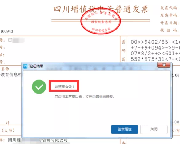 當(dāng)您使用OFD閱讀器打開該發(fā)票時(shí),鼠標(biāo)移至稅務(wù)機(jī)關(guān)監(jiān)制章處,點(diǎn)擊鼠標(biāo)右鍵,出現(xiàn)驗(yàn)證、屬性選項(xiàng),選擇驗(yàn)證有如下提示(如下圖,以四川省為例)。